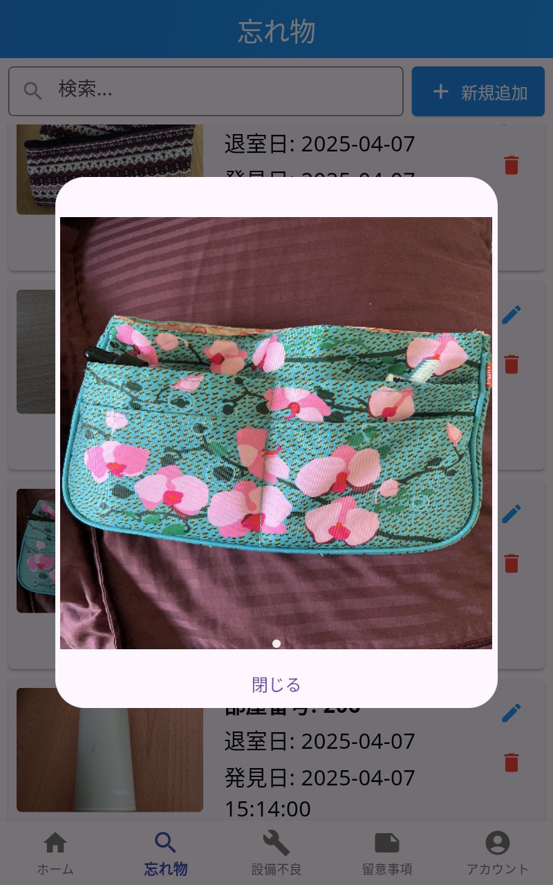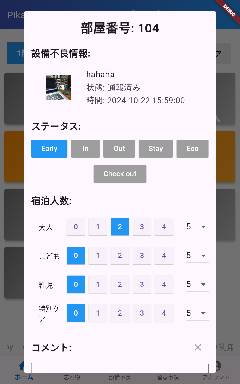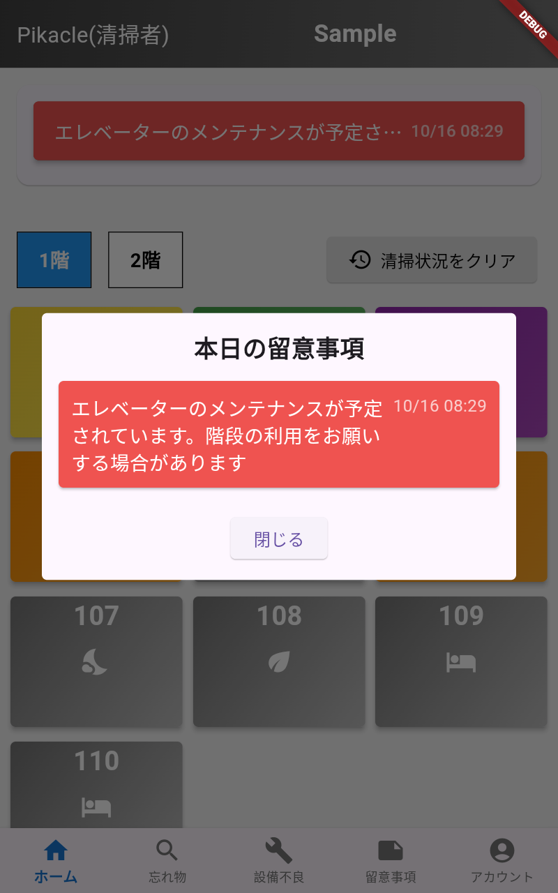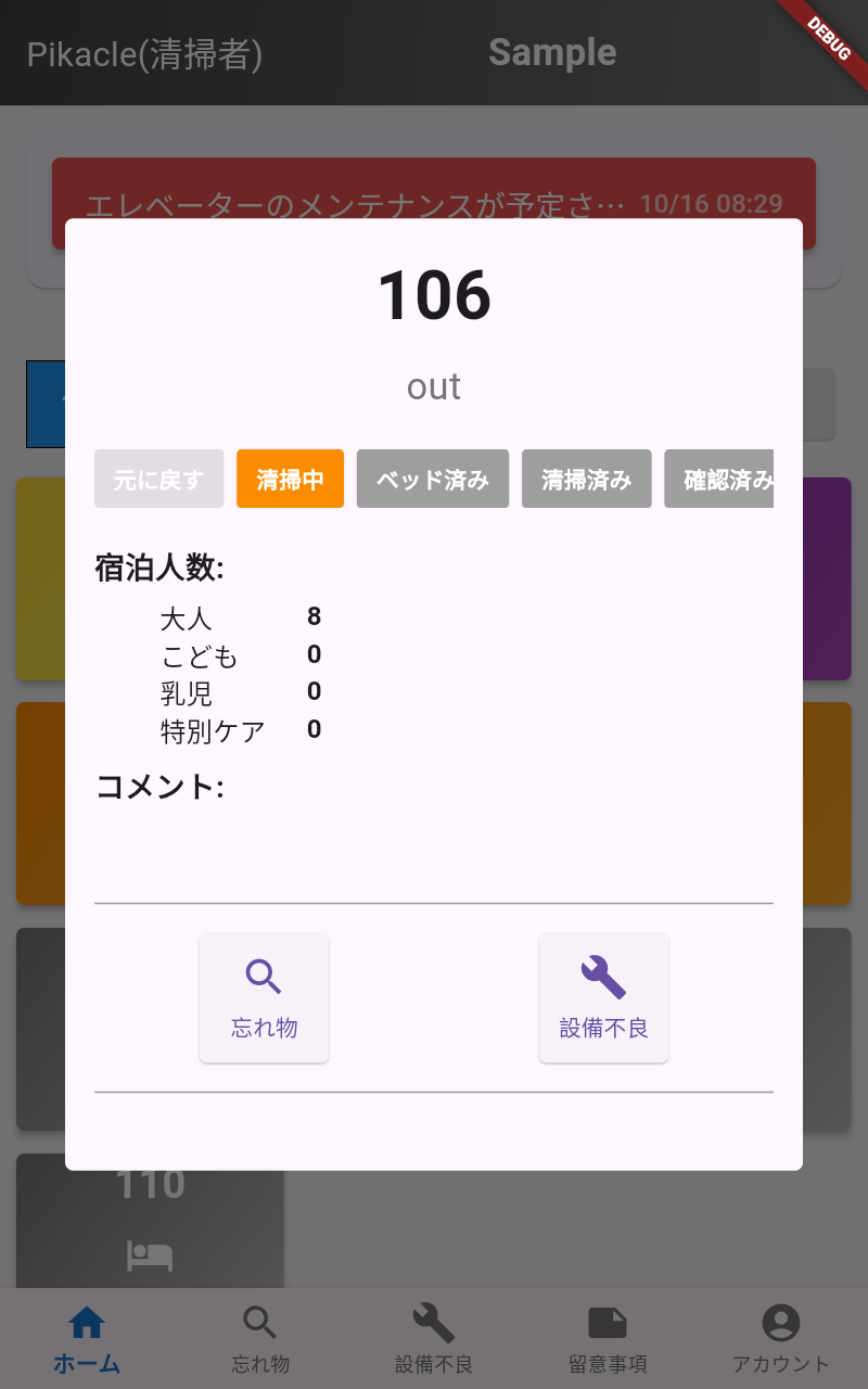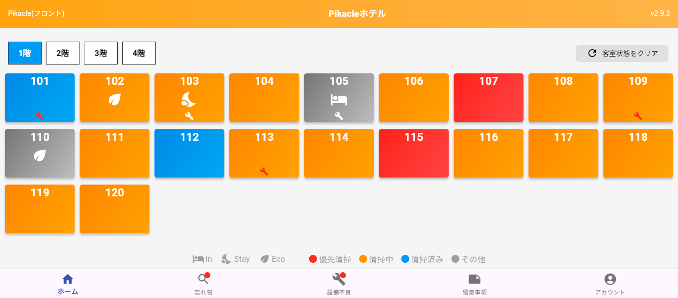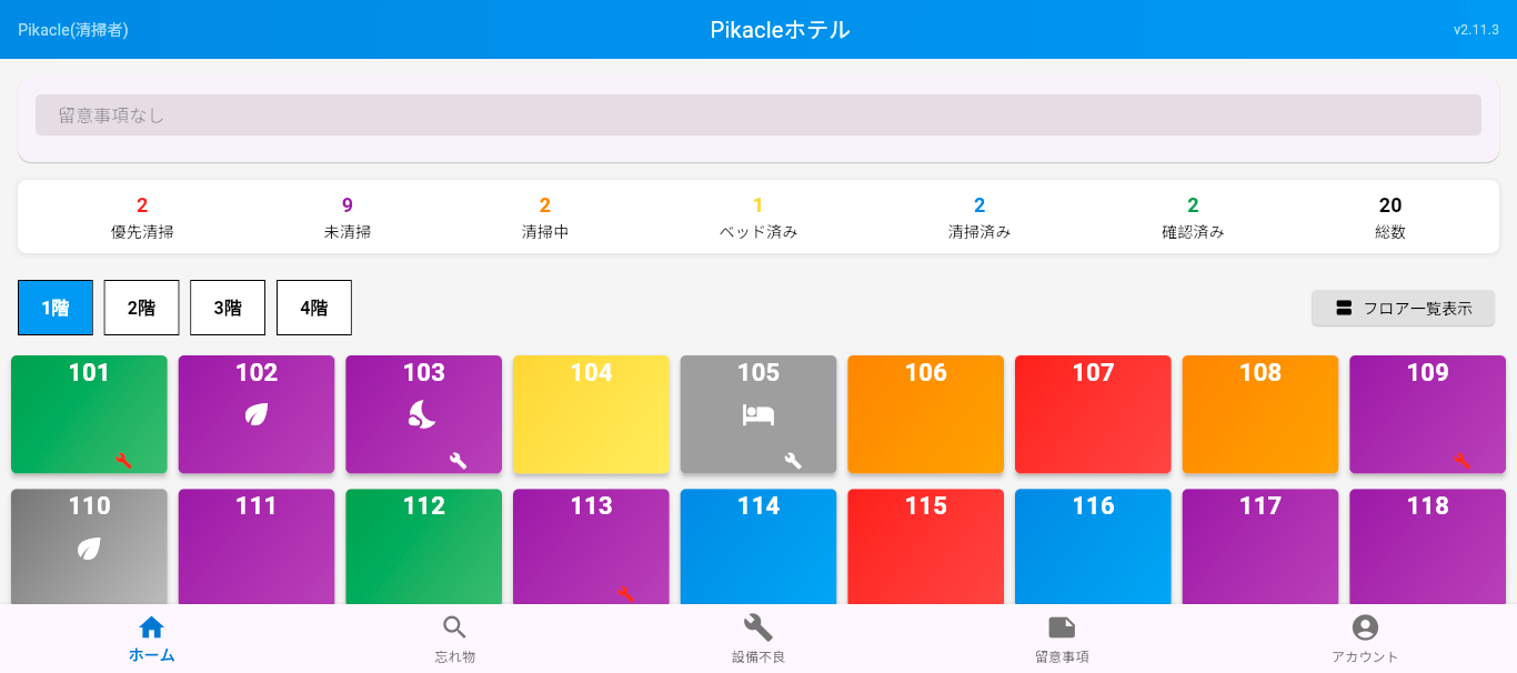 Pikacleの機能 Pikacleは、紙や電話によるストレスの多い業務をデジタル化することで解決します。もう繋がらない電話に苦労することはありません。 スタンダード機能 清掃業務を手軽にデジタル化!操作もシンプルで安心。 ログイン機能 & スタッフ管理 QRコードによるログインと、ID、パスワード入力によるログインが可能。清掃スタッフ別にログイン有効時間の設定し、スタッフの管理をすることができます。 Email | PW ログイン清掃スタッフ QRコード ログイン清掃スタッフ スタッフ管理清掃管理者 本日の特記事項 新規でテキストの入力はもちろん、過去に入力し、保存された事項はワンタップで選択。 指示内容入力HOTELフロント 指示の確認清掃スタッフ 客室・清掃のステイタス変更・確認 基本情報は選択式で、誰にでもできる簡単入力。部屋ごとの特記事項もコメントで情報をリアルタイで共有。 客室ステイタス設定フロント 進捗情報確認フロント| 清掃スタッフ 清掃ステイタス入力清掃スタッフ 忘れ物・設備不良報告・確認機能 カメラで撮影するだけ。客室やチェックイン情報と紐づけされ報告。管理画面で確認、オンタイムで対応、その後もフォローアップも楽々。 忘れ物報告清掃スタッフ 忘れ物管理HOTELフロント | 設備管理者 設備不良報告清掃スタッフ 設備不良管理HOTELフロント | 設備管理者 HOTELフロント(PC版) 以下のリンクよりアクセスしてください。 HOTELフロント(PC版)へ 清掃管理者(PC版) 以下のリンクよりアクセスしてください。 清掃管理者(PC版)へ オプション機能(開発中) より高度な機能で、清掃管理を次のレベルへ。毎日の業務を進化させる機能です。 さらなる効率化を目指して! 清掃スタート・終了時間表示 CSV出力で清掃スタッフの作業時間を効率的に集計。人材育成に役立つデータを提供。 サプライ管理 シーツやアメニティの在庫管理と自動発注を行い、在庫が設定値を下回った際には自動で発注メールを送信。 PMS 連携 客室ステイタスを自動入力 より効率的な機能で、時間を軽減。 ※※PMS側でインポート・エクスポートに対応している必要があります。 モニター募集中! 1ヶ月無料!その間に御社のニーズをお聞かせください。お希望に沿った機能を追加し、より環境にあったシステムをご提案します! Contact NOW